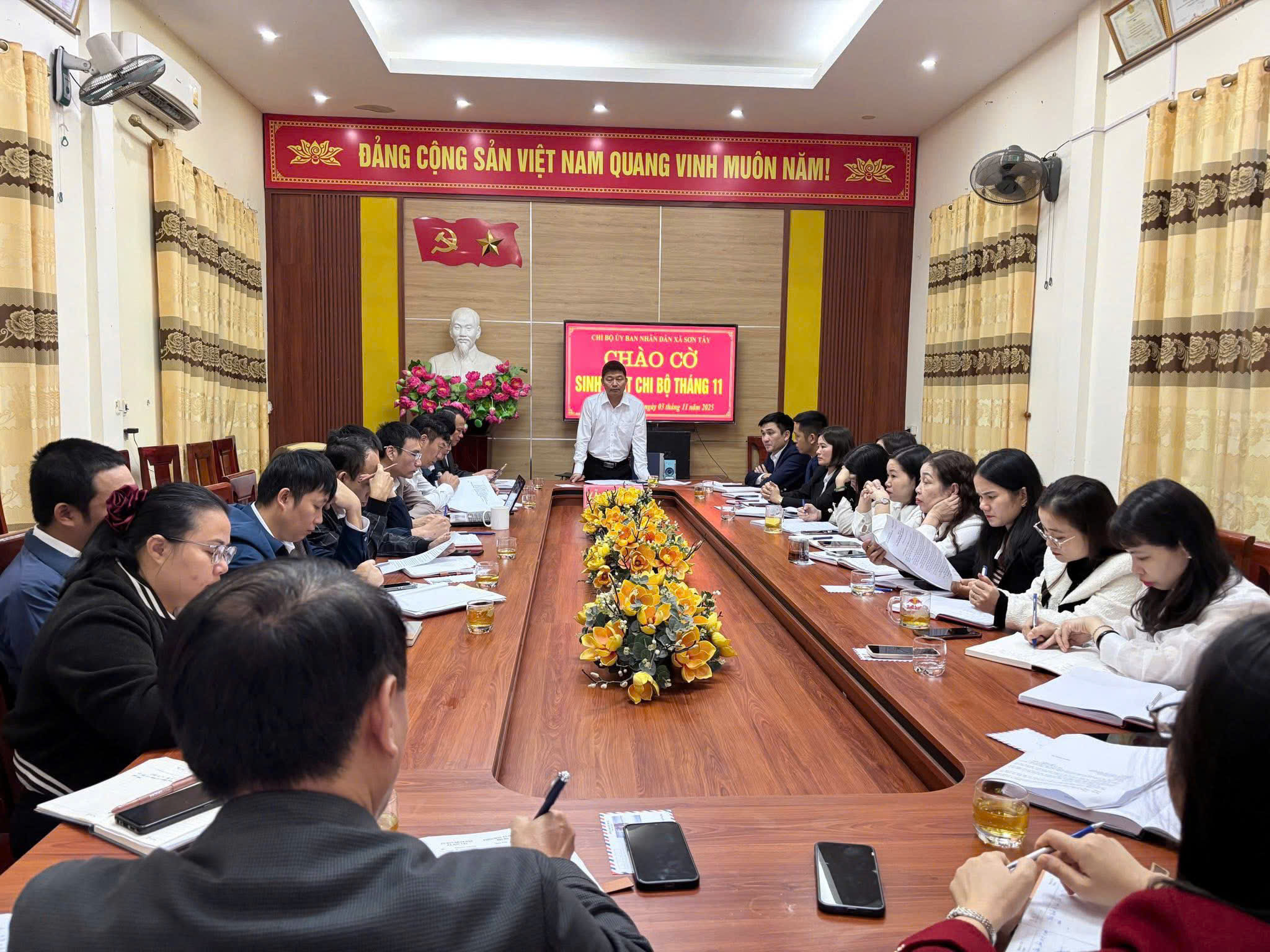 Sáng ngày 3/11/2025, Chi bộ cơ quan UBND Xã Sơn Tây tổ chức Lễ chào cờ đầu tháng ; Tổ chức lấy ý kiến với các dự thảo văn kiện Đại hội XIV của Đảng và tổ chức phát động Tháng cao điểm “Vì người nghèo” năm 2025.